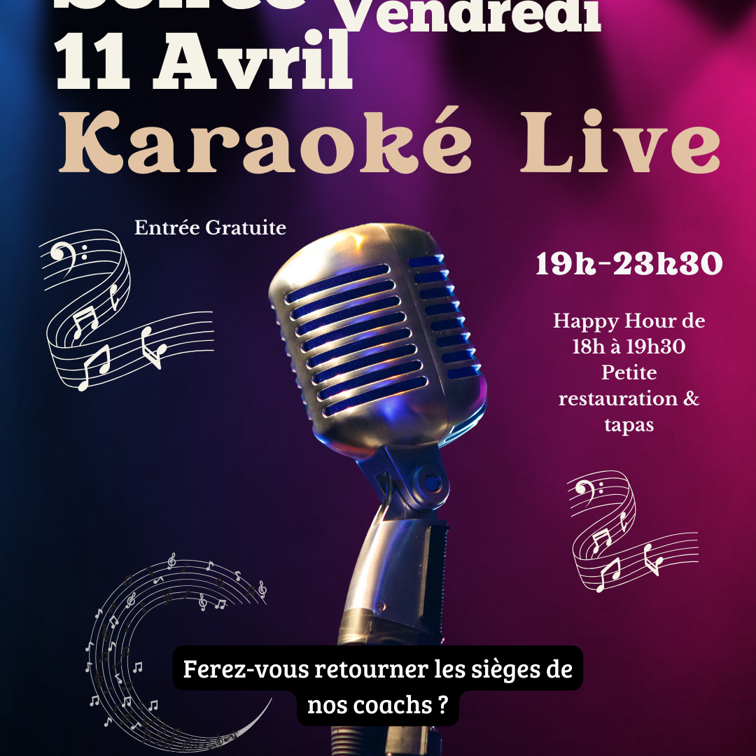 🎶 Dès 19h, prenez le micro et laissez-vous emporter dans une ambiance survoltée ! Que vous soyez en solo, en duo ou en groupe, venez partager un moment fun et musical entre amis, en famille ou en amoureux.